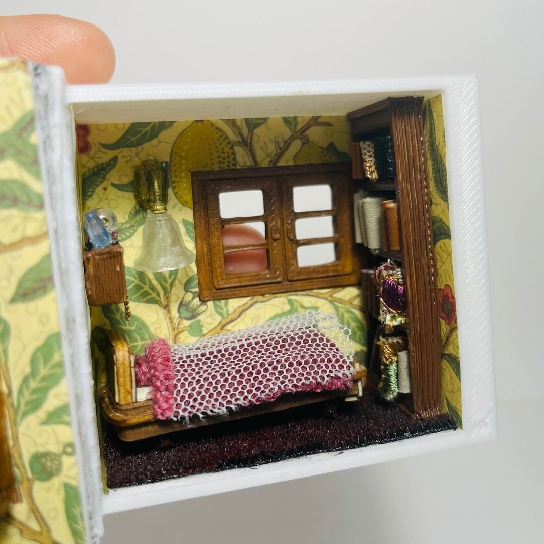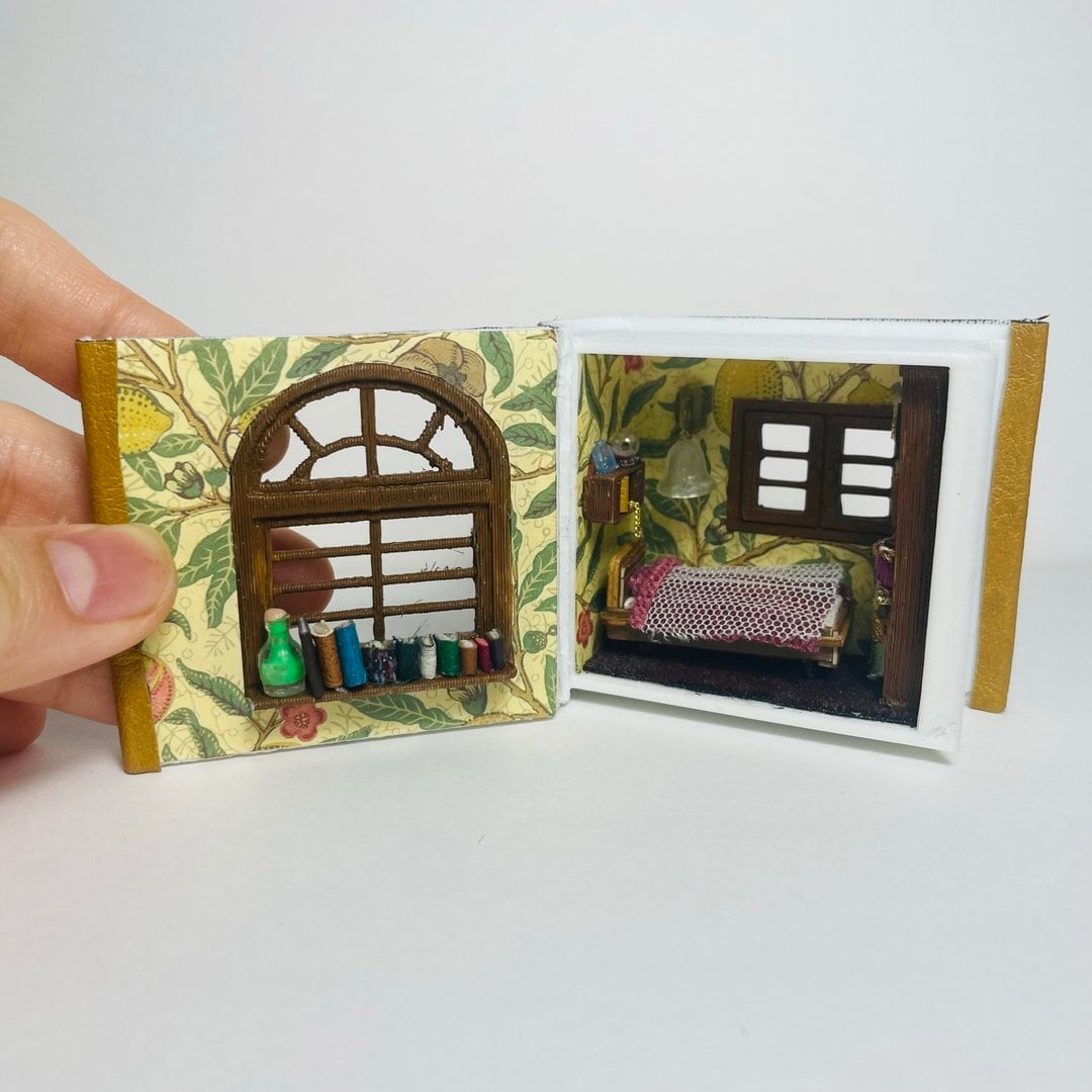 ミニチュア 本型ドールハウス ベッドと本棚のある寝室 1/48 ナチュラルインテリアギフト プレゼント 誕生日